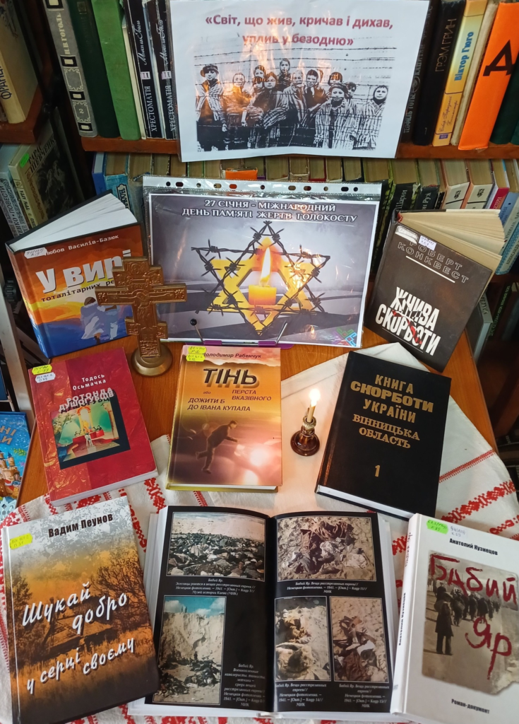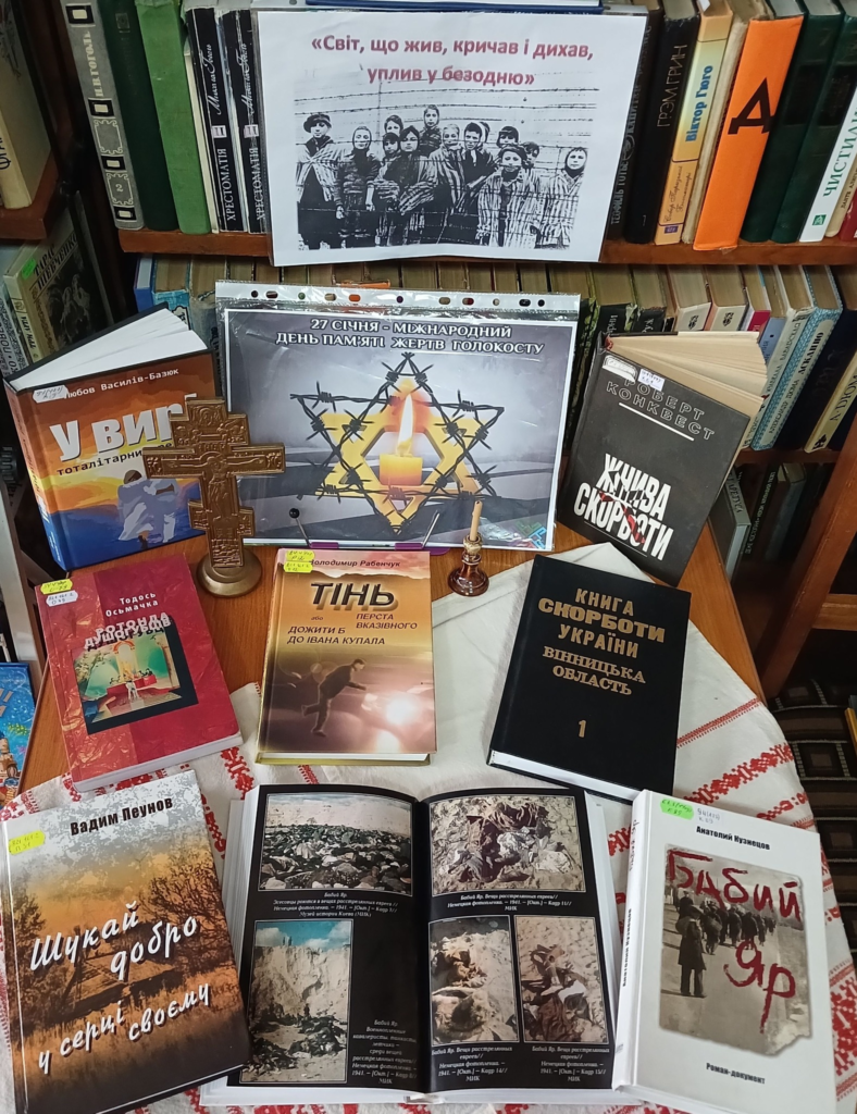 27 січня в Україні та світі вшановують пам’ять жертв Голокосту – однієї з найстрашніших та найжорстокіших сторінок історії людства XX сторіччя. Під час цієї трагедії на Вінничинні було знищено майже 200 тисяч євреїв. До цієї трагічної та жахливої дати у Барському ліцеї #3 була створена книжкова виставка “Світ,що жив, кричав і дихав, уплив у безодню”.